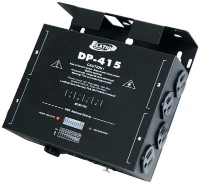 The ADJ DP-415R is a compact, portable 4-channel DMX dimmer/switch pack that has eight 3-prong 15 Amp Edison socket (2 for each channel) allowing you to be able to control up to 8 fixtures. The pack has a 4-button digital display menu and is RDM (Remote Device Management) compliant.
