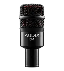 Designed, machined, assembled and tested by Audix in the USA, the D4 is a dynamic instrument microphone used for stage, studio and broadcast applications. The D4 is characterized with a hypercardioid pickup pattern for isolation and feedback control and is equipped with a VLM™ (Very Low Mass) diaphragm for natural, accurate sound reproduction. The D4 is lightweight, compact and easy to position. With a wide frequency response of 40 Hz - 18 kHz and the ability to handle sound pressure levels in excess of 144 dB, the D4 is an excellent choice for miking instruments requiring precise low frequency reproduction such as large rack toms, floor toms, cajon, djembe, tympani, Leslie bottom, bass flute, sax and baritone sax, trombone, clarinet, acoustic bass, bass cabs and small kick drums. The D4 is manufactured with a precision machined aluminum body, durable black anodized finish, dent resistant steel mesh grill and gold plated XLR connector. Transformerless design, low impedance, and balanced output allow for interference-free performance even with long cable runs.