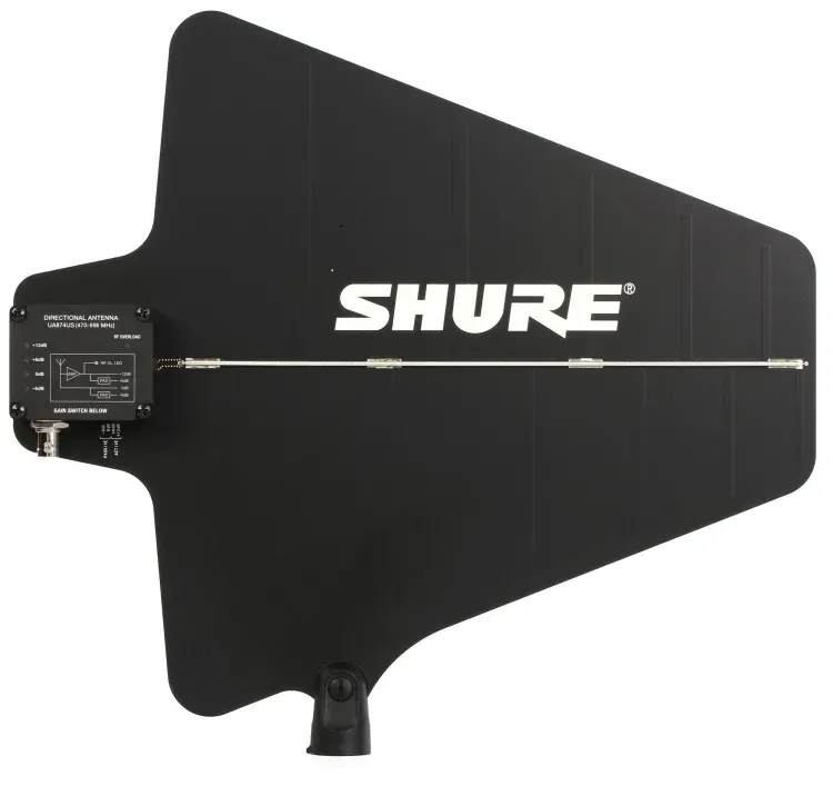The Shure UA874US Active Directional Antenna is a professional UHF antenna designed to improve wireless microphone system performance by focusing reception toward the intended coverage area while rejecting unwanted RF signals.